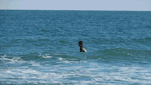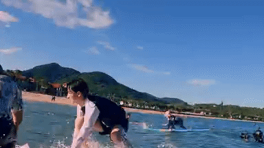 对于冲浪初学者,对游泳水平其实没有要求,但是太怕水也不行。做教练时候的东子,会带着第一次冲浪的学员,在能踩到海床、海水刚好齐胸的区域练习。