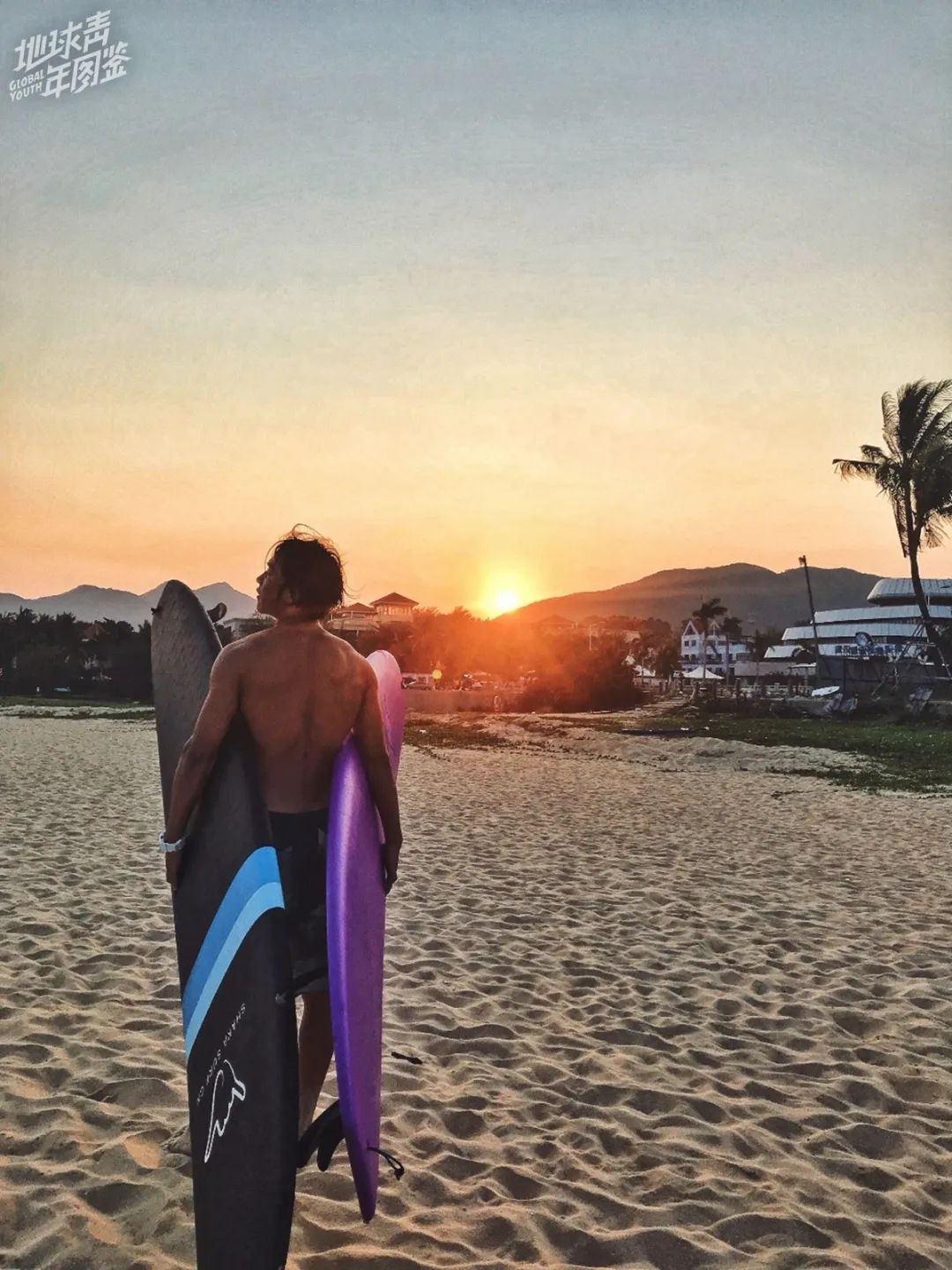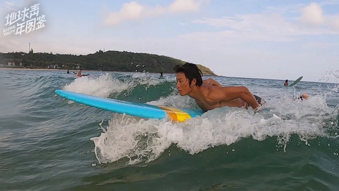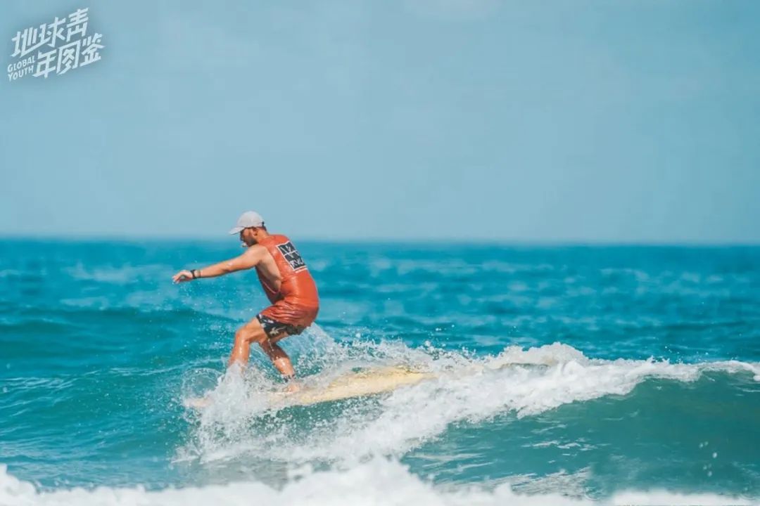 有一次采访工作太累了,他逃离北京来到海南日月湾,想给自己放个10天的假。没想到这里的冲浪生活太适合自己了,一待就留下来了,还做起了冲浪教练。