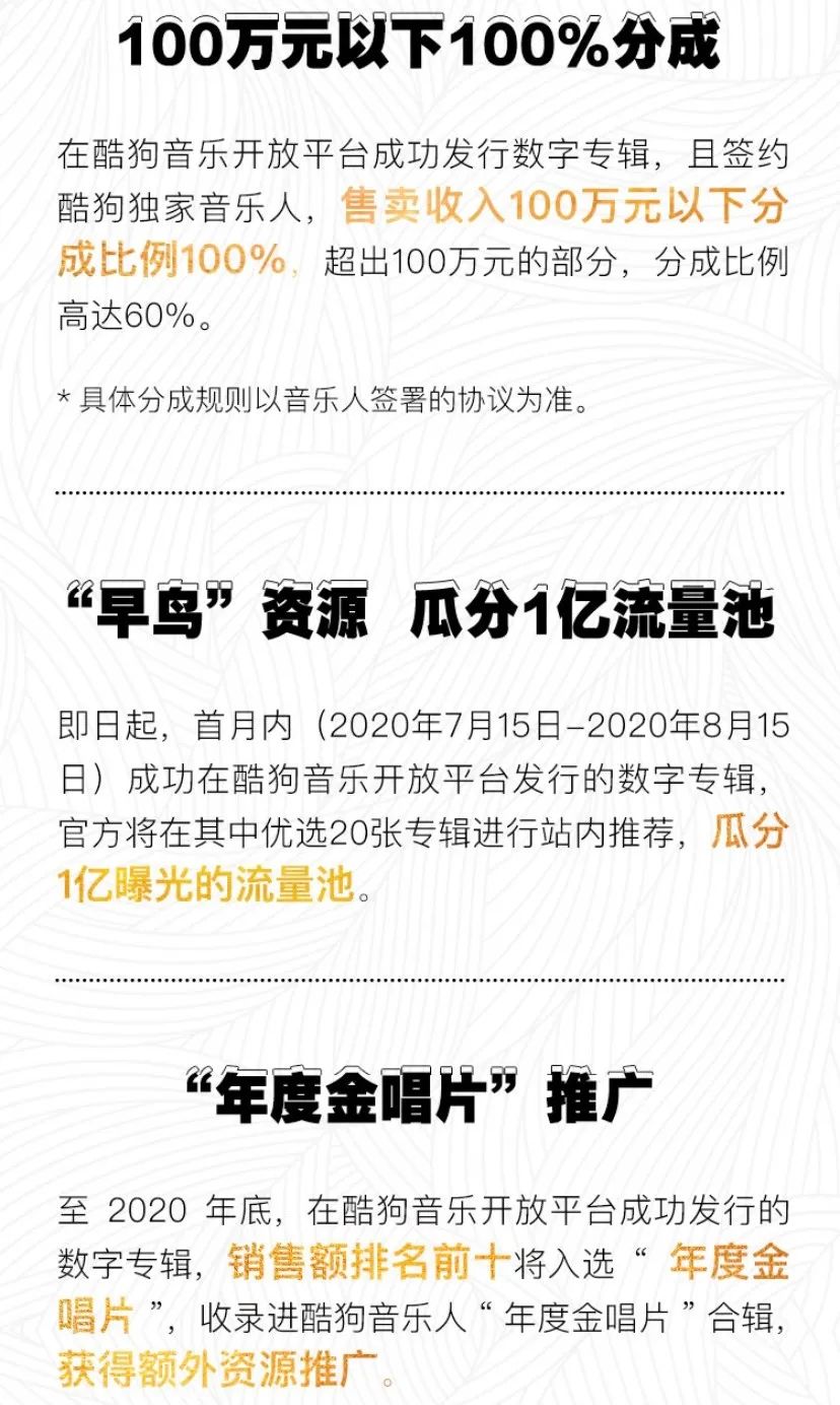 “星曜唱片计划”另外一个关键点,便是音乐人首月发行(7月15日至8月15日)的专辑作品还将获得酷狗音乐的“早鸟”资源:官方将在首月发行的作品中优选20张专辑进行站内推荐,瓜分1亿元的流量池,这也为一些优质作品降低了宣发层面的经济负担。不管是付费单曲/数字专辑,想要获得好的成绩,除了粉丝忠诚度和购买力之外,宣发自然也不能掉队,如果能获得音乐平台的流量资源扶持,那音乐人便可以在更低的成本下获得更高的曝光度。