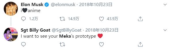 他还发了一条推特说 “ 我爱动漫 ”,然后网友回复他 “ 那让我康康你的机甲原型好吗