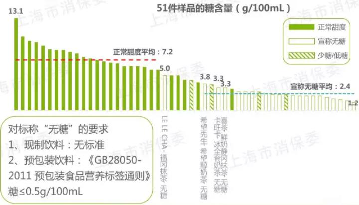 经过检测,无糖奶茶(500ml)的平均含糖量为12g,其中,含糖量最高的无糖奶茶为25g,同样高于标准。