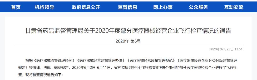 7月20日,甘肃省药品监督管理局官网发布关于2020年度部分医疗器械经营企业飞行检查情况的通告。根据《医疗器械监督管理条例》《医疗器械经营监督管理办法》《医疗器械经营质量管理规范》《医疗器械经营企业分类分级监督管理规定》等法律、法规、规章规定,2020年6月2日-6月11日,省药监局组织4个飞行检查组对9个市州的部分医疗器械经营企业进行了飞行检查,现将检查情况通告如下: