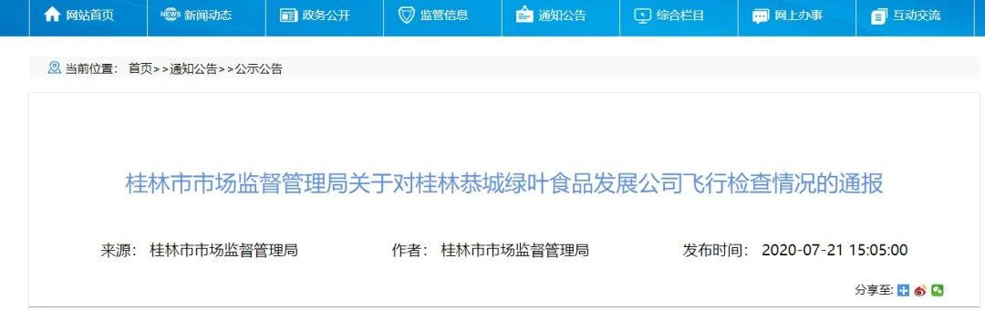 2020年7月21日,广西桂林市市场监督管理局网站发布关于对桂林恭城绿叶食品发展公司飞行检查情况的通报。