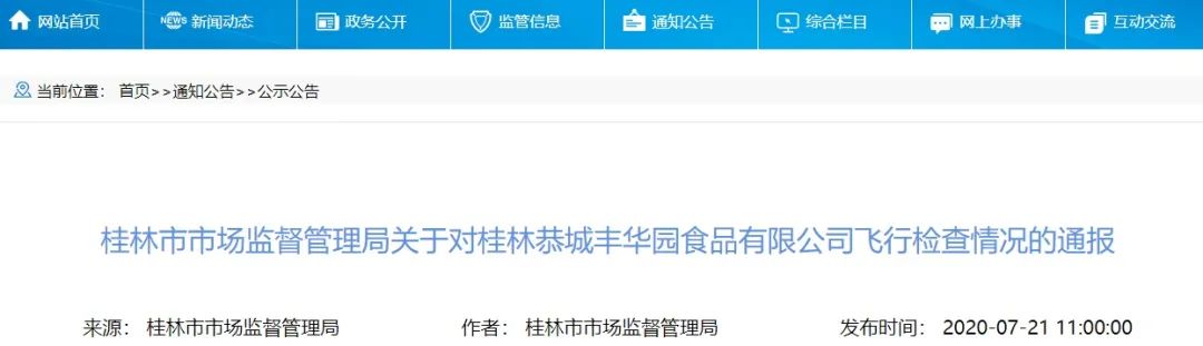 2020年7月21日,广西桂林市市场监督管理局网站发布关于对桂林恭城丰华园食品有限公司飞行检查情况的通报。