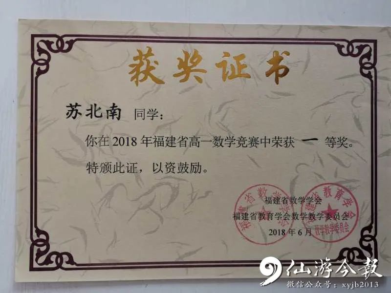高中三年,苏北南多次在学科竞赛中取得骄人的成绩。2018年在参加福建省高一年数学竞赛中获得省一等奖;2019年参加全国中学生生物学联赛中获省三等奖;同年参加全国高中数学联赛中获省一等奖。做为班级的团支部副书记,苏北南有志于将自身所学投入到奉献社会与持续提升自我之中,2019年4月被共青团仙游县委员会授予“仙游县优秀共青团员”称号。