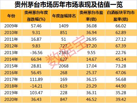 但放眼整个A股市场,贵州茅台历年涨幅排名并没有大幅居前,比如2016年涨幅位居第268位,2019年涨幅位居第228位,2020年涨幅位居第847位。