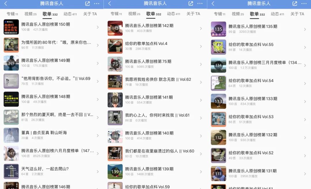 成立以来,腾讯音乐人每个月都会发布原创音乐榜单,这些榜单中有着很多熟悉的面孔,如简弘亦、徐秉龙、陈柯宇、双笙、苏运莹、万妮达等皆是。三年里,榜单中大热作品不在少数,如《千禧》、《直到遇见了你,我只喜欢你》等作品收藏量已突破百万,《折枝问雪》、《六耳》等以往小众的国风作品收藏量也突破了万人。