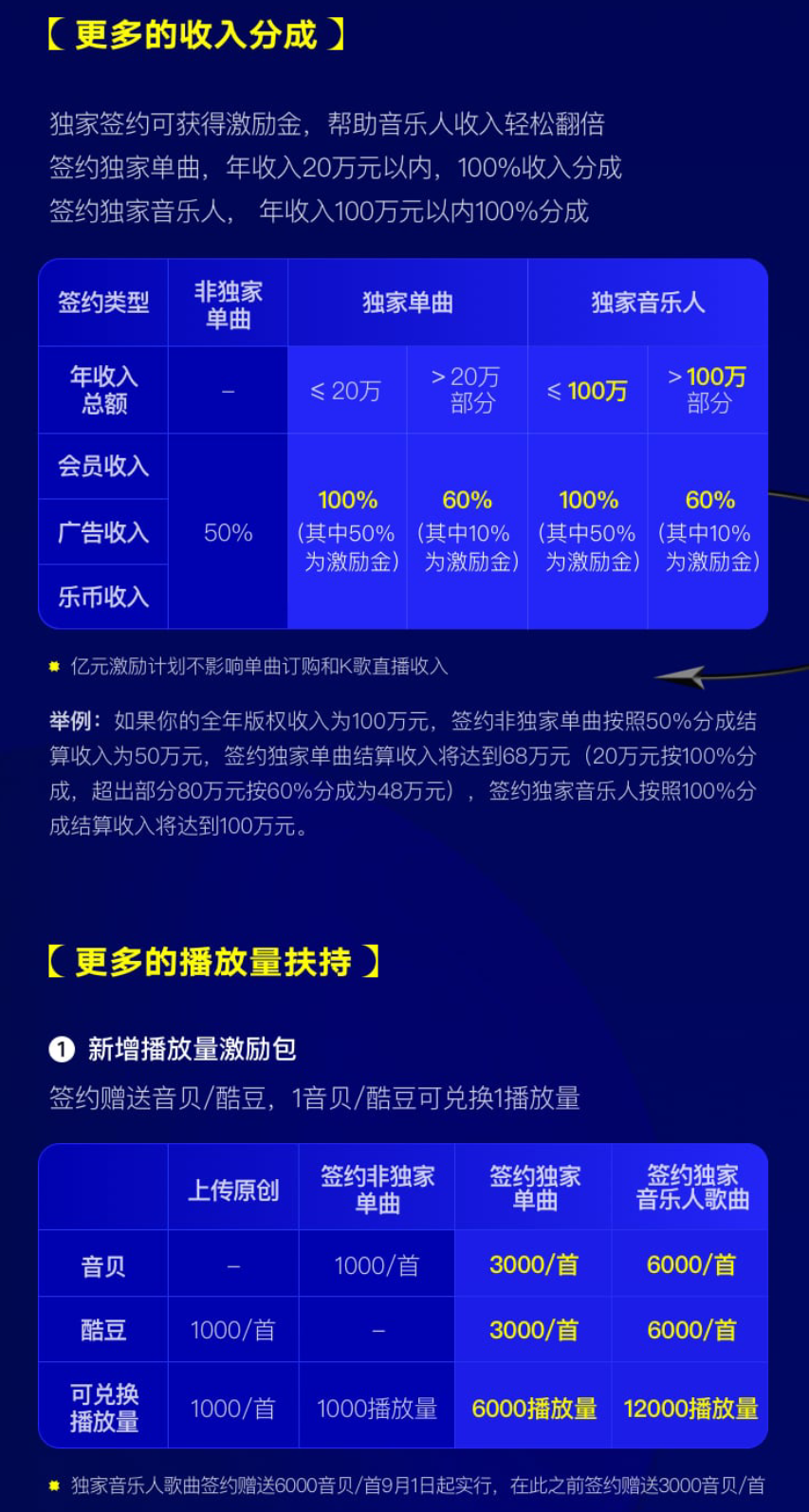 三周年之际,腾讯音乐人也推出了亿元激励计划的全新升级版——亿元激励计划2.0。在该计划中,腾讯音乐人提出,独家音乐人年总收入100万以内,音乐人将获100%分成,超出100万的部分,分成比例高达60%。将音乐收入尽可能给到音乐人的同时,TME旗下各平台的各大计划也以独家推广、专题制作、首页推荐、优质流量加持等为音乐人提供了足够的曝光量,让他们在“歌找人”时代能迅速找到自己的受众群体。