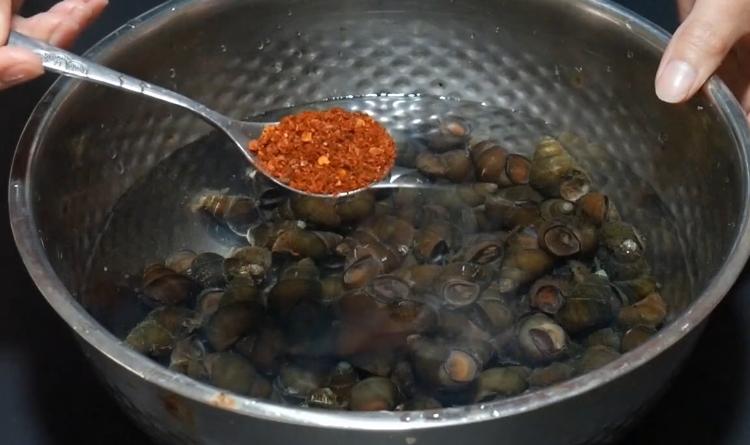 把田螺清洗干净以后,泡在清水中,接着放一勺辣椒粉,再倒入一些白醋,用勺子搅拌均匀,辣椒粉和白醋都可以刺激田螺吐泥沙,搅拌好了后让田螺浸泡三个小时,时间到后把脏水倒掉,再用清水冲洗两遍,田螺吐泥沙就冲洗干净了。