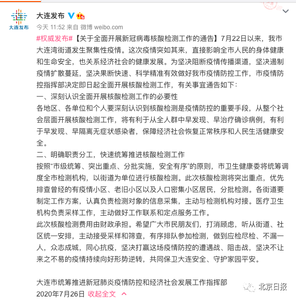 26日,大连发布《关于全面开展新冠病毒核酸检测工作的通告》:7月22日以来,我市大连湾街道发生聚集性疫情。市疫情防控指挥部决定即日起全面开展核酸检测工作。