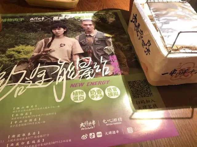 开在城西街头的这家网红夜宵店,名叫“大肆撸串”。一进门,餐厅灯光旖旎,墙上巨大的“浪”字,透露出十足的文艺夜宵范儿。桌上铺满了店内植物肉的宣传海报,搭配了一个简易烧烤架,摞得满满的肉串,热气氤氲,升腾而起的都是食欲。