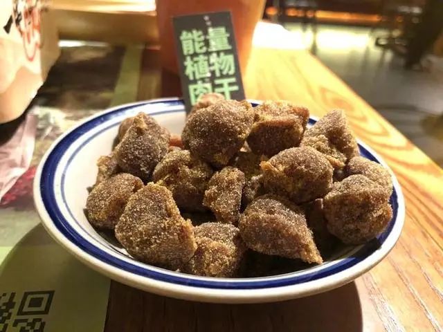 5分钟后端上桌的“人造肉”小食,乍一看,长相完全是大家熟悉的牛肉粒。轻咬一口,第一口很具有迷惑,与真肉相比基本无异。