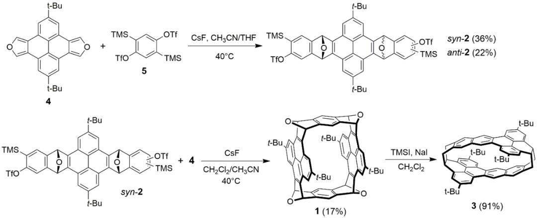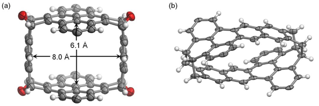 最近,香港中文大学缪谦研究组在合成锯齿型碳纳米环带的研究中取得进展。如图二所示,他们通过向[n]环并苯稠合苯环设计了一种新的锯齿型碳纳米环带,即四苯并[10]环并苯,它比[10]环并苯具有跟强的芳香性。为合成四苯并[10]环并苯,他们首先合成了形如盒子的前驱体1。如图二所示,合成1的关键是一个C形的结构单元 (syn-2),它在利用狄尔斯-阿尔德环加成反应构建大环的过程中提供了必要的弯曲度及刚性。而C形的结构单元syn-2 本身也是通过狄尔斯-阿尔德环加成反应而得到的。通过单晶X-射线衍射,1的结构得到了准确的表征(图三)。1经历还原芳构化的过程生成了氢化的碳纳米环带3,其结构也通过单晶X-射线衍射得到了准确的表征(图三)。随后,作者通过计算显示四苯并[10]环并苯具有较大的环张力(124.4 千卡/摩尔),这可以解释为何还原芳构化的过程没有生成预期的全共轭锯齿型碳纳米环带。