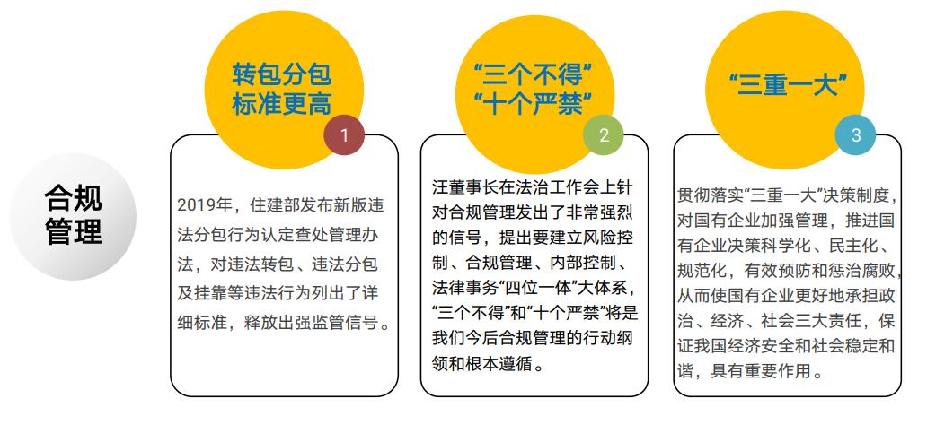 “三个不得”“十个严禁”。中国能建建立风险控制、合规管理、内部控制、法律事务“四位一体”大体系,“三个不得”“十个严禁”成为合规管理的行动纲领和根本遵循。