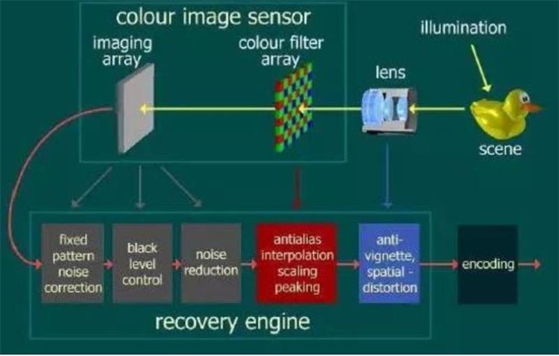 摄像头的工作原理是将拍摄对象通过镜头( lens),将生成的光学图像投射到传感器上(colour image sensor),然后光学图像被转换成电信号,进行降噪等操作后,电信号再经过模数转换变为数字信号,数字信号经过 DSP 加工处理,再被送到处理器中进行解码( encoding)处理,最终转换成我们能够看到的图像。