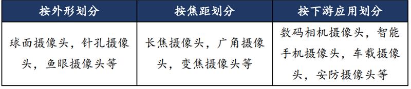 技术升级推动摄像头种类扩展。摄像头按照外形以划分成球面摄像头,针孔摄像头,鱼眼摄像头等;而按照焦距可划分为长焦摄像头,广角摄像头,变焦摄像头等;按下游应用可分为数码相机摄像头,智能手机摄像头,车载摄像头,安防摄像头。