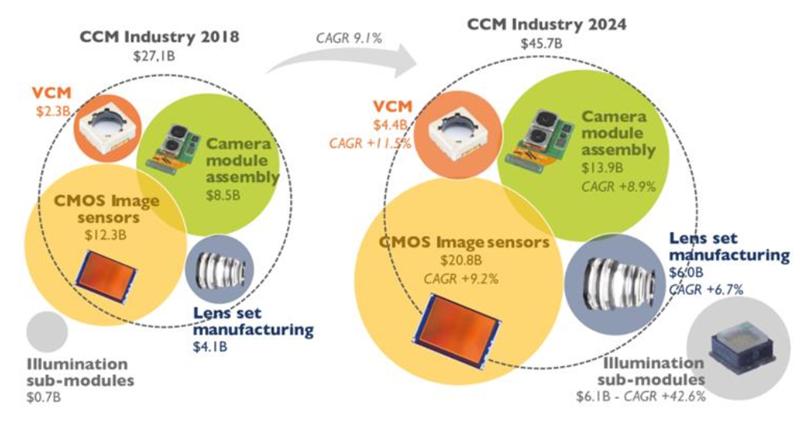 需求增长+技术升级推动手机摄像头各组件及整体市场规模扩张。根据 Yole 数据,2018-2024 年, CIS 市场规模将从 123 亿美元增长到 208 亿美元, CAGR 为 9.2%;镜头市场规模将从 41 亿美元增长到 60 亿美元, CAGR 为 6.7%;音圈马达市场规模将从 23 亿美元增长到 44 亿美元, CAGR 为 11.5%;模组封装市场规模将从 85 亿美元增长到 139亿美元, CAGR 为 8.9%;全球手机摄像头市场规模将从 271 亿美元增长到 457 亿美元,CAGR 为 9.1%。受益于下游需求增长及技术升级,从摄像头各组件到整体都有望迎来高速增长期,行业景气度持续提升。