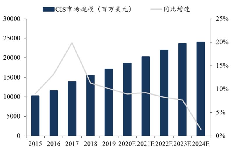 CIS 市场规模和总体出货量有望不断走强。目前大部分带有摄像头设备使用的都是CIS, 根据 Yole 数据, 2015-2018 年, CIS 市场规模由 102.48 亿美元增长到 154.78 亿美元, CAGR 为 10.86%,预计 2024 年达到近 240 亿美元,整体规模不断上升;根据群智咨询数据, 2019 年全球 CIS 出货量高达 47 亿颗,预计 2024 年可攀升至 65 亿颗。