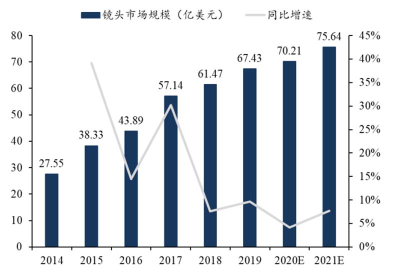 镜头市场规模持续增长,下游应用占比稳定。受益于手机、车载、监控等市场的发展,镜头市场规模连年递增,根据中国产业信息网数据, 2014-2019 年,全球镜头市场规模从 27.55 亿美元增长到 67.43 亿美元, CAGR 为 16.09%,预计 2021 年可达约 75.64亿美元。