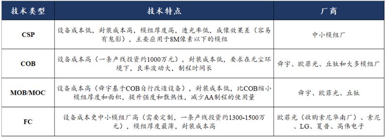 MOB/MOC 是模组封装技术未来趋势。模组封装是将摄像头零组件整合成为摄像头的加工过程,手机摄像头模组主流封装工艺有 CSP、 COB、 MOB/MOC 和 FC 四种,其中 CSP 主要用于低端产品, COB 是目前最主流的工艺, MOB/MOC 是 COB 改造升级后的技术,暂时只有少数大厂商在使用, FC 则仅有苹果在使用。COB 封装正向 MOB和 MOC 发展, MOB 与 COB 的区别在于底座与线路板一体化, MOB 通过将电路器件包覆于内部,降低了模组厚度,而 MOC 比 MOB 更加先进的地方在于将连接线一起包覆于内部,进一步降低了模组厚度。MOB/MOC 相较 COB,封装性能更优,并且正在逐渐接近 FC 封装性能,同时相较于 FC 成本更低,是模组封装的未来趋势。
