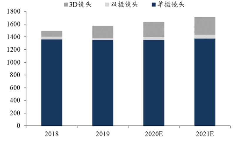 前置 3D 摄像有望增加。根据 IHS 数据, 2018-2021 年,前置单摄镜头、双摄镜头出货量基本稳定不变,而 3D 镜头出货量将 0.85 亿颗增长 2.7 亿颗,其占比也由 5.65%升至 15.64%。