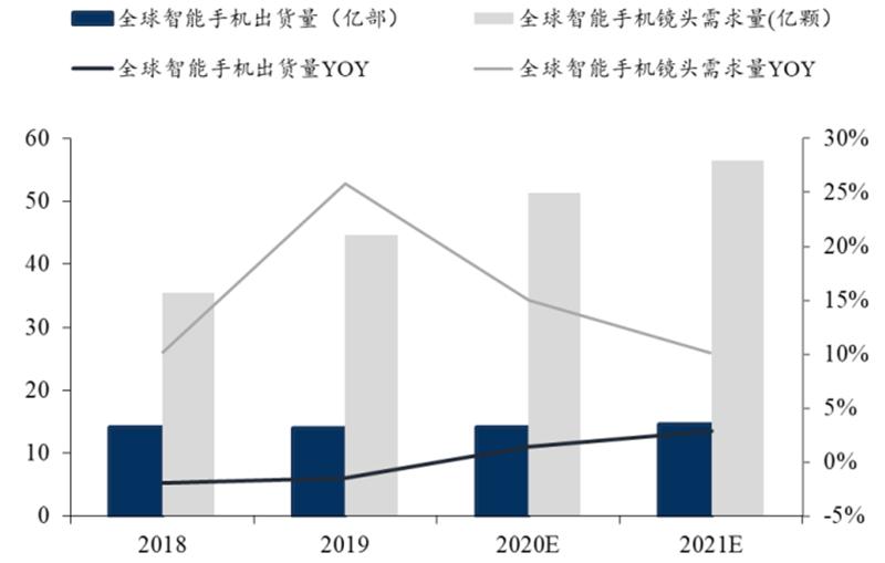 手机存量市场下,光学升级推动镜头需求量稳定增长。根据 IHS 数据, 2018-2021年,全球智能手机出货量将从 14.17 亿部增长至 14.56 亿部, CAGR 为 0.91%;全球智能手机镜头需求量将从 35.47 亿颗升至 56.50 亿颗, CAGR 为 16.79%。经过我们计算,平均每部智能手机镜头数将从 2.50 颗升至 3.88 颗, CAGR 为 15.78%,说明在人口红利消失,手机进入存量时代下,单机平均镜头数仍然将保持稳健增长,手机多摄增加已然成为趋势。