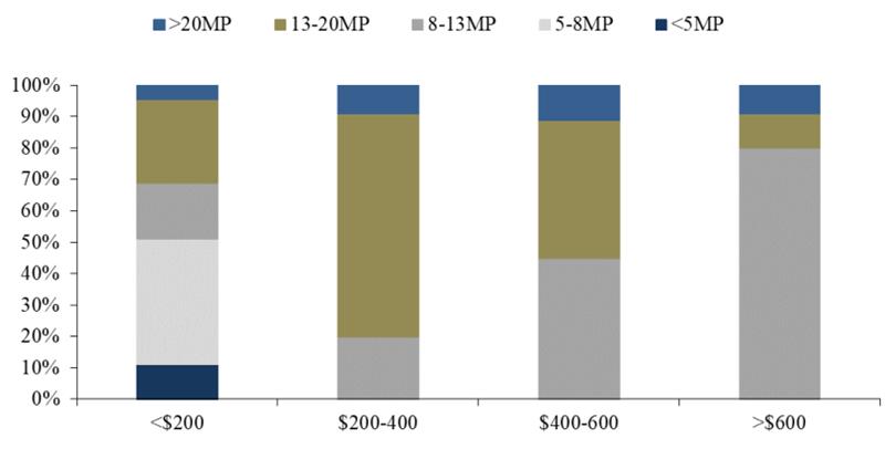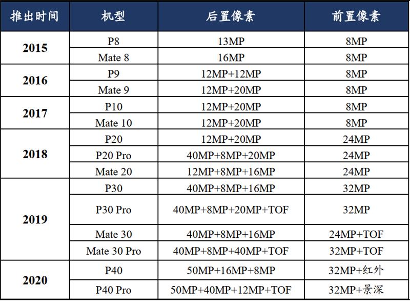 像素是手机厂商镜头升级的重要方向。像素是摄影的基础,像素越高,照片分辨率就越大,镜头对画面的解析能力就越强。根据 Yole 数据, 2017 年$200 以上价位的手机中, 8-13MP、 13-20MP 像素的摄像头成为主流,两者占比合计达到 90%,手机千万像素成为普遍现象。2015-2019 年,华为手机前置、后置像素同步升级,前置主摄像素自8MP 升至 32MP,后置主摄像素自 13MP 升至 40MP,2019 年推出的 Mate 30 Pro 搭载前置 32MP,后置广角双 40MP+长焦 8MP+TOF 四摄镜头,而小米新推出的 CC9 Pro 前置像素达到 32MP,后置主摄像素达到 108MP,像素成为手机的重要卖点,也是手机的关键参数,未来升级化趋势不可避免。