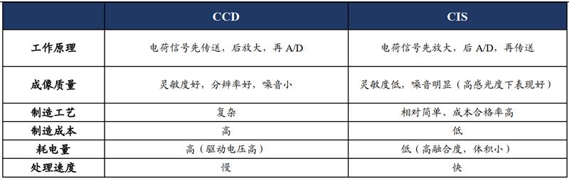 高像素时代下, CIS 为摄像头行业首选。成像过程中,手机镜头先捕捉画面,转化成电信号,再由图像传感器将电信号转化成数字信号,经过 DSP 处理后,再形成图片,图像传感器在其中的作用至关重要。图像传感器可分为 CCD(电荷耦合器件)和 CMOS(互补金属氧化物半导体)传感器( CIS)两种。CCD 灵敏度高、分辨率高、噪音小,但是 CIS 能耗低、体积小、 重量轻、集成度高、价格低,而且经过像素与 CMOS 的迭代升级,在高感光度下也能有很好的成像质量,所以 CIS 已成为摄像头首选方案。