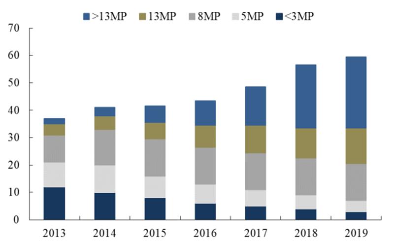 高像素 CIS 出货量激增。随着高像素镜头用量增加,与之匹配的高像素 CIS 出货量也同步上升,根据 Yole 及观研天下数据, 2013-2019 年, 5MP 及以下的 CIS 出货量自21 亿个降至 7 亿个, 13MP 像素及以上的 CIS 出货量自 6 亿个大幅增长至 39 亿个,高像素 CIS 出货量迅速提升。