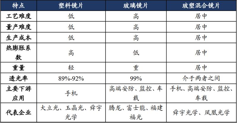 而在安防车载领域,对镜片透光率要求更高,而对成本相对不敏感,所以更多使用玻璃镜片。玻塑混合镜片透光率高于塑料镜片,量产难度与成本低于玻璃镜片,且可应用领域更为广泛,在手机、安防、车载领域均有使用,对于提升相片质量是较优的选择,因此玻塑混合镜片有望在未来得到广泛应用。