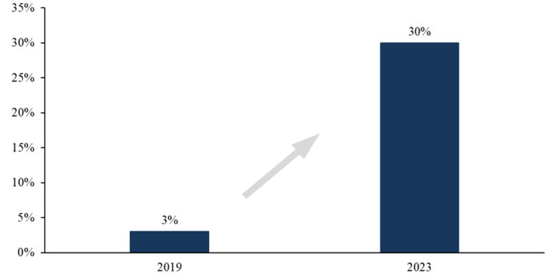 5G 时代搭载 TOF 镜头将成为未来趋势。从人脸识别到 AR/VR 虚拟现实, TOF 有望接力结构光,带来手机产业的全新升级,前置人脸识别+后置虚拟现实功能可能成为手机下一个发展趋势。对手机来说, TOF 比结构光更适合于 3D 视觉成像技术。TOF 前置镜头也能应用于面部识别解锁,加上 TOF 自身的优良特性,用户体验好,而且 TOF成本较低,应用范围更广,更为手机厂商所青睐,越来越多的厂商开始尝试后置摄像头TOF 方案。5G 商用为手机 3D 视觉的应用迎来新的发展机遇。在 5G 技术的支持下, TOF镜头将会逐步运用以满足 VR/AR 游戏场景等需求, 5G 时代搭载 TOF 镜头将成为趋势。根据 Techno Systems Research 数据, 2019 年采用 TOF 的智能手机渗透率为 3%,到 2023年渗透率有望突破 30%,成为中高端机型的标配。