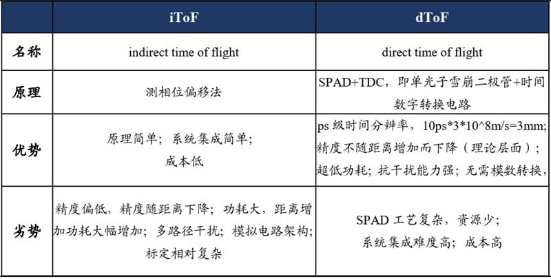 SPAD+TDC 是 dTOF 成败关键。在具体的实现上, dToF 相较于 iToF 来说难度要大很多。dToF 的难点在于要检测的光信号是一个脉冲信号,因此检测器对于光的敏感度比需要非常高。常见的 dToF 传感器实现是使用 SPAD( single-photon avalanche diode,单光子雪崩二极管)。此外,从读出电路来看, dToF 需要能分辨出非常精细的时间差(通常使用 time-to-digital converter, TDC 来实现)。例如如果需要实现 1.5cm 的测距精度,则 TDC 的分辨率需要达到 10ps,这并不容易。总体而言, dTOF 拥有响应快、功耗低、精度高等优势,未来有望成为 TOF 主流技术趋势。