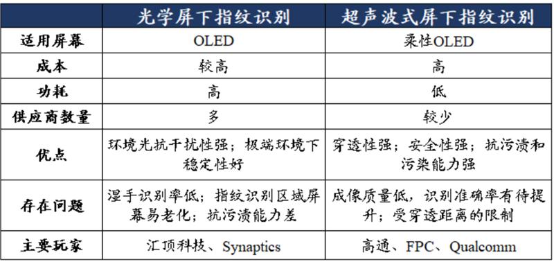 屏下指纹方式兴起。如今,由于手机全面屏技术的突破,屏下指纹应运而生。屏下指纹技术(Fingerprint on Display, FOD),是指在屏幕玻璃下方完成指纹采集并完成识别的新技术,主要利用光学、超声波等穿透技术,穿透各种不同的材质,从而达到识别指纹的目的。屏下指纹识别比较稳定,可以较大程度地降低手指污垢、油脂以及汗水对解锁的影响。屏下指纹主要有两种:光学屏下指纹和超声波屏下指纹。光学屏下指纹抗环境光干扰性强,但是指纹识别容易受污渍影响;超声波屏下指纹识别抗污渍能力较强,但成像质量低,识别率也有待提升。