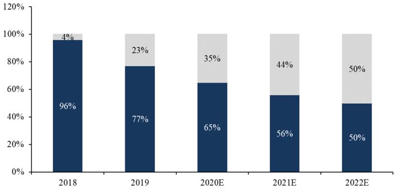 全面屏需求驱动光学指纹渗透率提升。目前,光学指纹识别产业链成熟,供应商数量较多。光学式屏下指纹识别凭借其技术优势、成熟的供应链和良好的用户体验,取得了大部分的市场份额。根据 Trendforce 数据, 2019 年屏下指纹识别中,光学占 82%,超声波占 18%。当下,全面屏手机已经成为智能手机选择的主流,随着光学屏下指纹识别技术的进一步成熟,成本会快速下降,运用光学屏下指纹方案的手机厂商会逐步增多。同时,随着 2020 年 LCD 屏下指纹识别方案量产,光学屏下指纹技术将会下沉到千元机的市场,渗透率将会得到快速提升。根据 IHS Markit 数据, 2019 年光学式指纹识别模组的出货量为 1.8 亿颗, 2021 年出货量有望超过 2.8 亿颗。