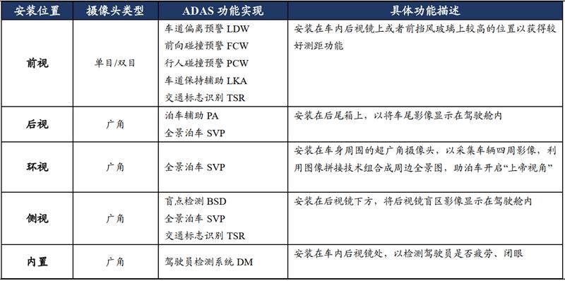 随着汽车驾驶自动化发展,特别是 ADAS 渗透率提高,车载镜头成为 ADAS车道偏离预警、交通标志识别等众多功能实现的必备传感器组件。根据安装位置的不同,可分为前视、后视、环视、侧视、内置五种,将与雷达等其他车载传感器共同作用,感知汽车行驶过程中的环境变化,进行动态、静态物体识别、侦测及追踪,从而预先告知驾驶者潜在风险,以提升驾驶的安全性及舒适性。