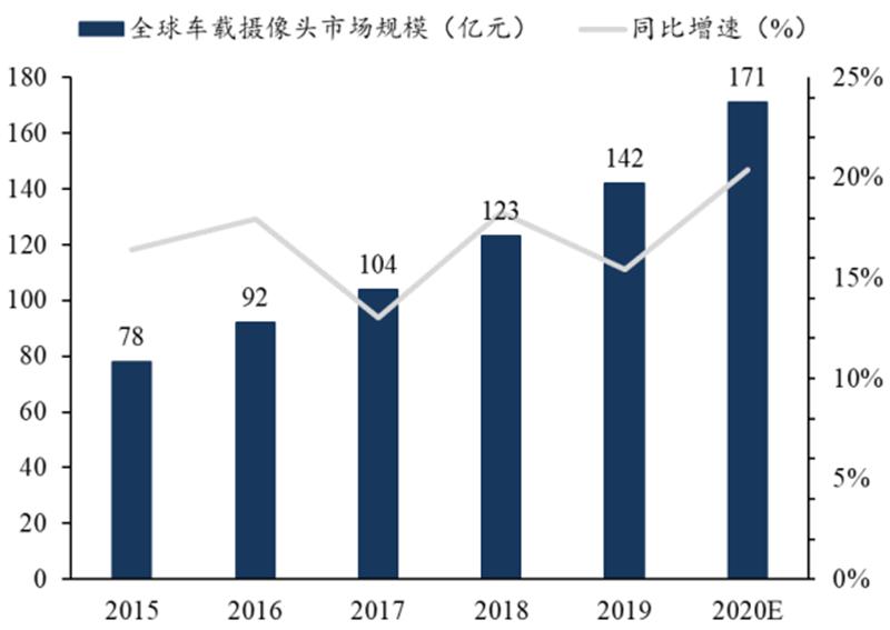 自动驾驶技术将有效促进驾驶安全,美国、日本等多国政府鼓励安装 ADAS 系统,进而加速 ADAS 技术渗透,车载摄像头需求将保持强劲,加之汽车市场规模基数较大,车载镜头市场规模将进一步提升。根据 IHS 及智研咨询数据, 2014-2020 年,全球车载摄像头出货量将从 2800万枚增长到 8277 万枚, CAGR 将达到 16.75%, 2015-2020 年,车载摄像头市场规模将从 78 亿元增长到 171 亿元, CAGR 为 13.98%。