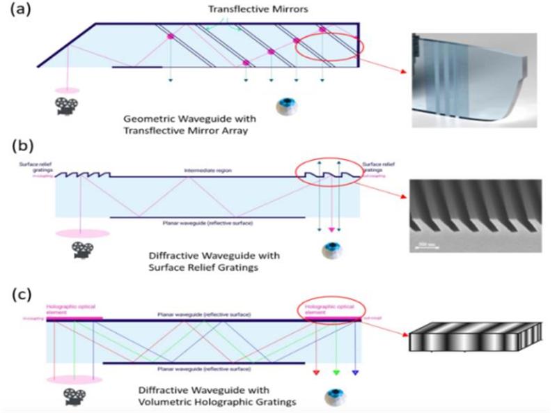 光波导“全反射”无损成像成为主流技术,推动 AR 在 C 端普及。光波导技术包括耦入、波导、耦出三部分,可将光线耦合进入玻璃基地,并通过“全反射”原理传输至眼前方释放,实现视场折叠和复原,保证光线无损传输。光波导的无漏损传输和高穿透性在实现了轻薄光学镜片的同时,亦可为用户提供较大的 FOV,保证眼镜成像清晰。此外,光波导是独立于成像系统而存在的单独元件,可将显示屏和成像系统移到额头顶部或其他位置,减少对用户的视线阻挡,优化设备佩戴感受。因此,光波导技术逐渐被视为满足 AR 眼镜成像需求的主流解决方案,有望促进 AR 眼镜向 C 端普及。
