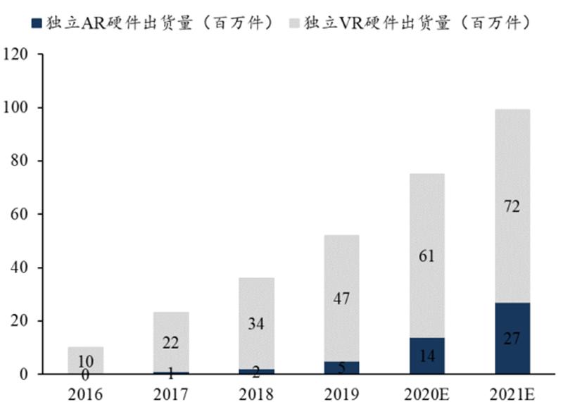AR/VR 有望成为 5G 最终受益端。目前 VR 产业逐渐步入高速发展阶段,产品形态基本成型,成像画质逐渐提升,用户体验不断优化。5G 通讯网络高速传送及云渲染技术有望推动 AR/VR 产品技术进一步更迭,刺激市场需求增长。根据 IDC 数据, 2021 年全球独立 AR 及 VR 硬件出货量将分别达到 2700 万件、 7200 万件。而赛迪顾问数据显示,截止 2021 年,我国 AR/VR 市场规模将达到 544.5 亿元,同比增长 95.2%, AR/VR有望成为 5G 最受益终端。