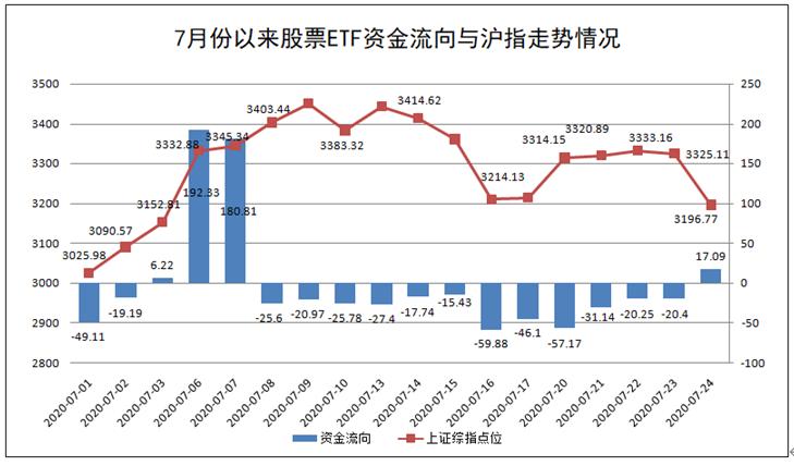 整体而言,随着7月份以来股市的“先扬后抑”,股票ETF市场也出现“越涨越卖,越跌越买”的理性操作的特点。截至7月24日,今年7月份以来股票ETF整体净流出资金为39.7亿元。
