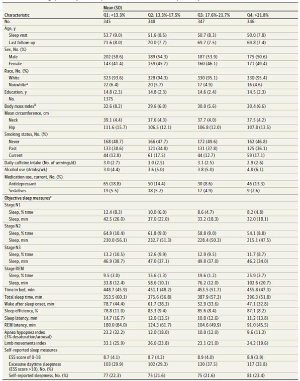 MrOS队列的平均REM的总睡眠时间占比(以下简称REM占比)为19.2%,在REM占比较低的人群中,可以观察到抗抑郁药物使用频繁、患高血压、心脏病、短暂性脑缺血发作和更低水平体力活动与之相关。WSC队列与MrOS在REM睡眠四分位数上分布类似,但平均REM占比为17.6%,较MrOS稍低。研究者认为这可能是由于量队列受试者的睡眠环境差异所导致的。