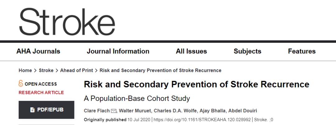 2.Flach C, Muruet W, Wolfe CDA, Bhalla A, Douiri A. Risk and Secondary Prevention of Stroke Recurrence: A Population-Base Cohort Study [published online ahead of print, 2020 Jul 10]. Stroke. 2020;STROKEAHA120028992. doi:10.1161/STROKEAHA.120.028992.