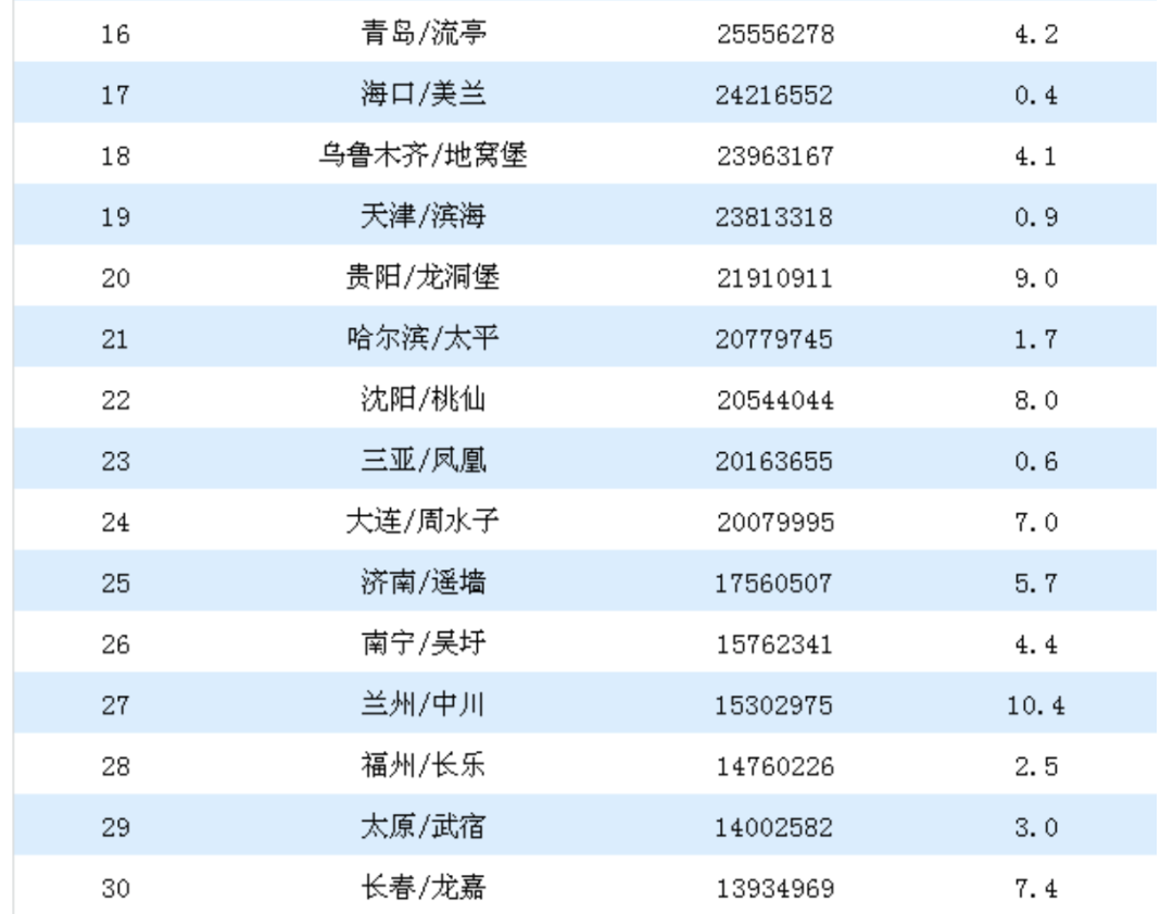 从机场吞吐量看,不管是旅客吞吐量还是邮货吞吐量,长春龙嘉机场在四大城市中,均居末位。