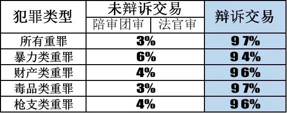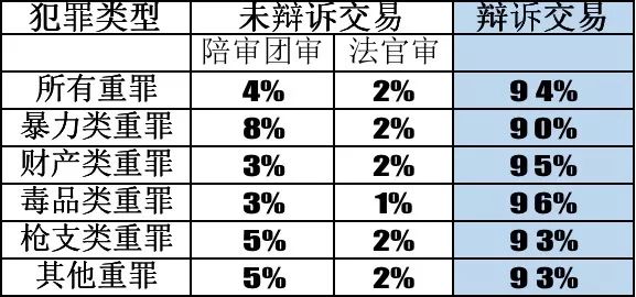 另外,暴力犯罪罪犯的辩诉交易比例最低,毒品犯罪罪犯的辩诉交易比例最高。