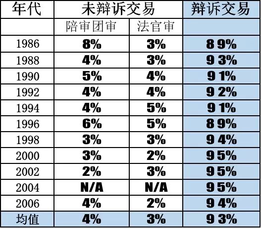 整体而言,1986至2006年的20年间,美国州法院被告人辩诉交易的比例为93%。