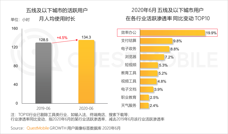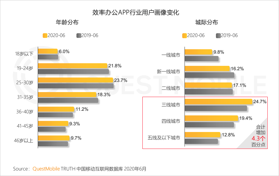 5、五线及以下城市用户对互联网了解和使用深度不断加深,近一年以来最显著的变化是,办公类应用作为组织运营的数字化平台,帮助乡镇村实现数字化转型