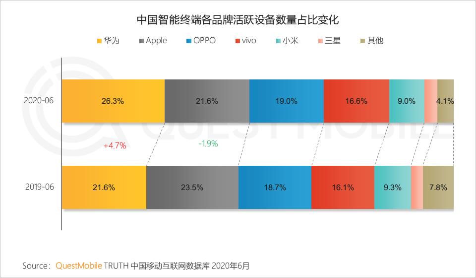 5.1 安卓品牌终端份额进一步扩大,华为取代苹果成为活跃设备数量第一品牌,OPPO、vivo品牌份额也有所增加
