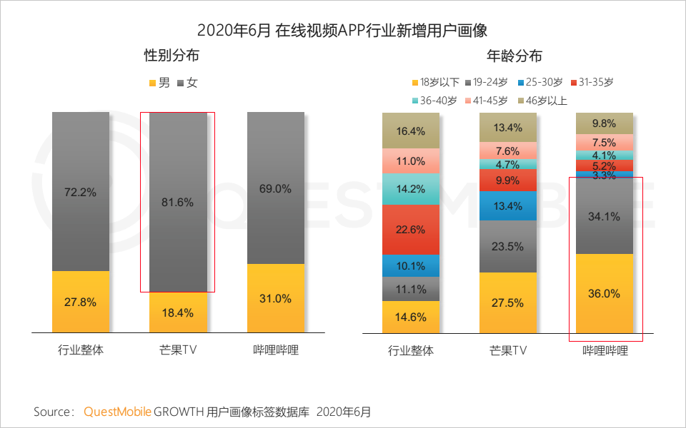 2.3 在线视频行业新增用户中18岁以下和31岁以上、女性、下沉城市用户更多;其中哔哩哔哩新增用户中24岁以下的占比是行业整体的近3倍,芒果TV则受到更多女性青睐