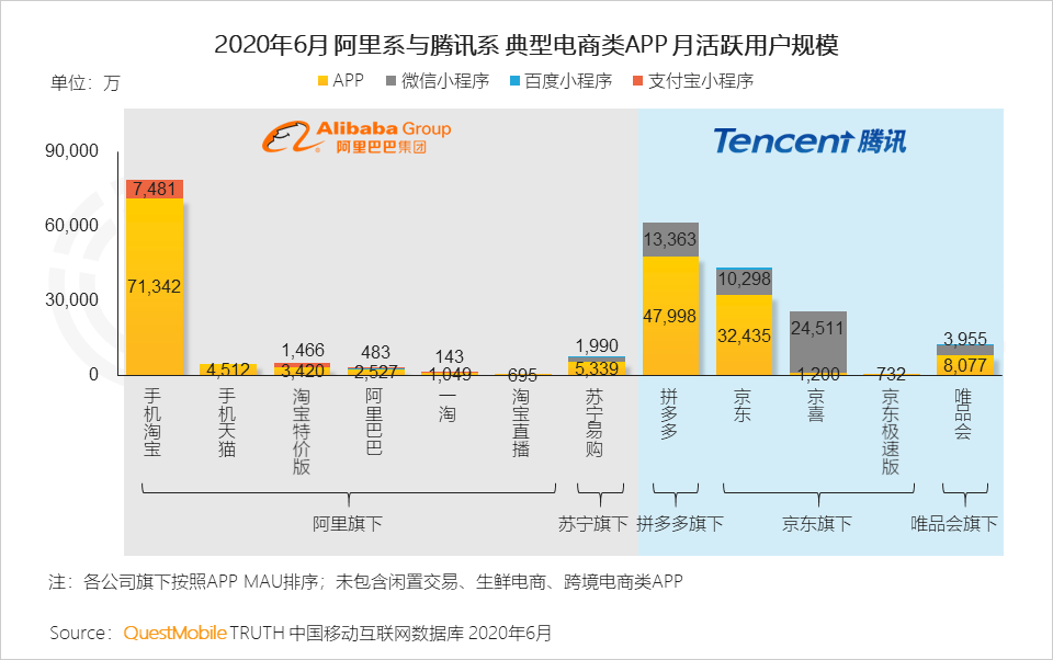 7.3 巨头对在电商领域的竞争愈加白热化,阿里系以手机淘宝APP形成一超多强局面,腾讯系以微信小程序开辟新战场,协助孵化多个亿级玩家