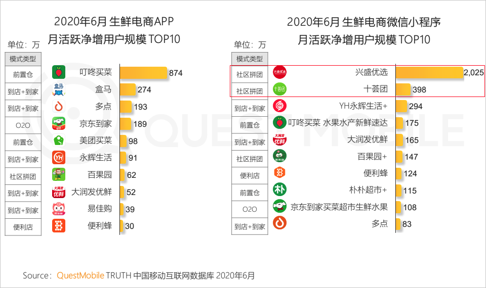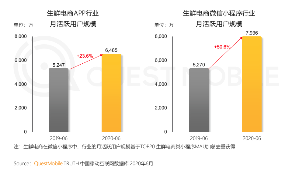 7.6 生鲜电商大受青睐,解决基本的生理需求;通过社交亲友推荐,小程序成宅家在线逛菜场新宠,相比APP行业,用户规模与同比增速均更高