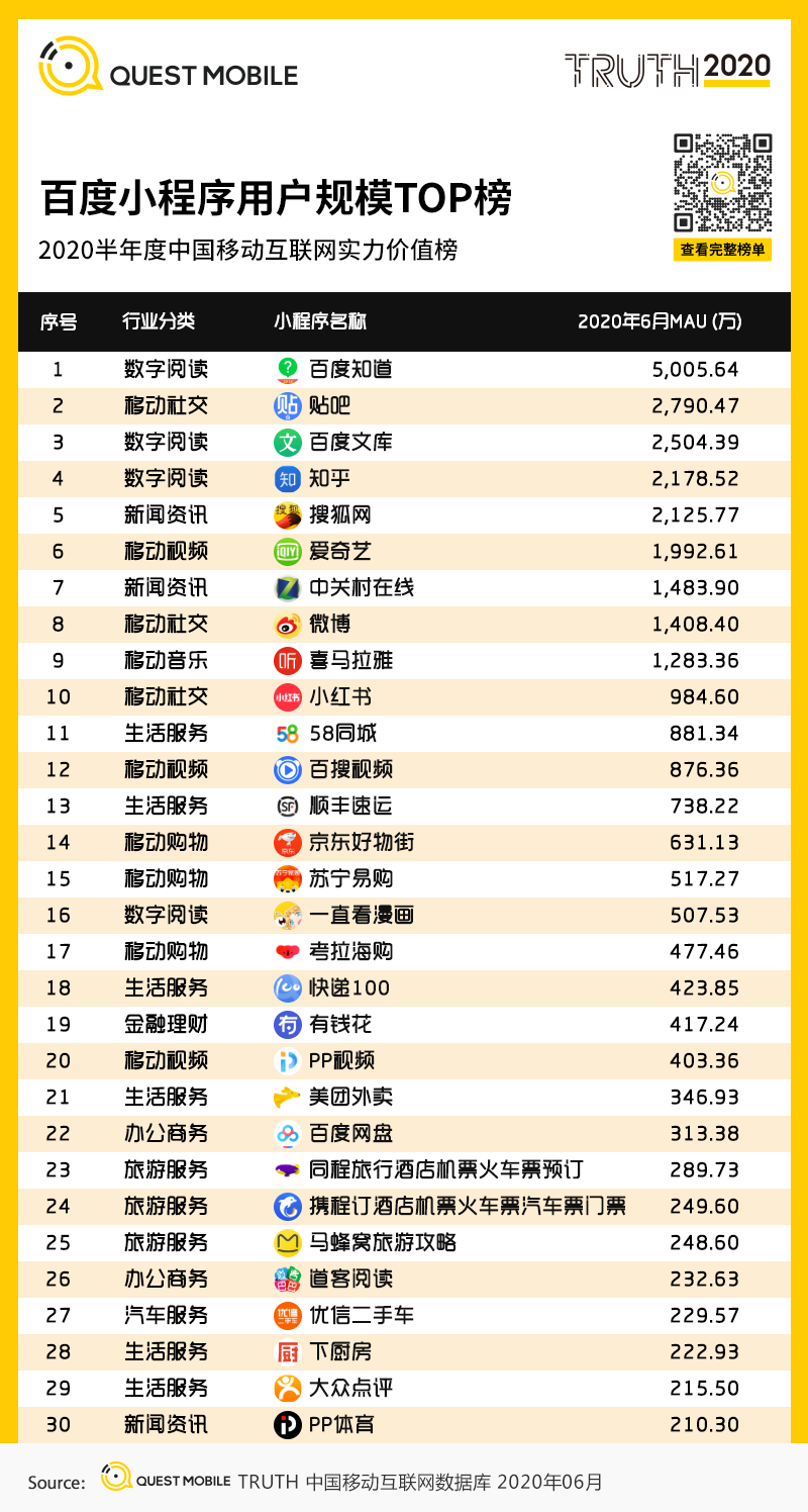 8、百度小程序用户规模TOP榜